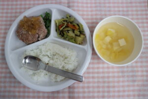 1月23日(金)給食・おやつ 公開済み: 2026年1月23日更新: 2026年1月23日作成者: ことね保育園カテゴリー: 調理室から 給食🍚🍴 ☆ごはん ☆ハンバーグオニオンソース ☆ひじきのカレー炒め ☆すまし汁(白菜、豆腐) 豚肉100%のハンバーグ✨✨ サッパリオニオンソースがよく合います😋 小松菜をごまで和えたお浸しを添えて~🤗🎶✨ おやつ(🕒✨15時) ☆ココアホットケーキ ☆麦茶 厚みがあってふんわり食感が美味しい、ココアホットケーキ✨✨ ボリューム満点! お腹もいっぱいになりました~🤭 関連記事 12月15日(水)給食・おやつ 給食🍚🍴 ☆ごはん ☆ポークビーンズ ☆レーズン入り白菜サラダ ☆すまし汁(小松菜、豆腐) レーズンの甘酸っぱさが美味しい白菜サラダ🥗✨ レーズンはふやかし […] 公開済み: 2021年12月15日更新: 2021年12月15日作成者: ことね保育園カテゴリー: 調理室から 12月11日(月)給食・おやつ 給食🍚🍴 ☆ごはん ☆ハンバーグ ☆白菜とブロッコリーのナムル ☆すまし汁(豆腐、小松菜) 豚肉100%のボリューミーハンバーグ✨ 一口大にカットしているので食べやすく、パ […] 公開済み: 2023年12月11日更新: 2023年12月11日作成者: ことね保育園カテゴリー: 調理室から 8月4日(金)給食・おやつ 給食🍚🍴 ☆ごはん ☆豚かぼちゃカレー風味 ☆小松菜と海苔の和風サラダ ☆みそ汁(茄子、油揚げ) ひびき組さん、ねいろ組さんが育てているピーマンを、ついに‼‼収 […] 公開済み: 2023年8月4日更新: 2023年8月4日作成者: ことね保育園カテゴリー: 調理室から