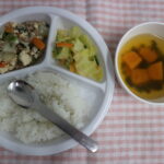 10月19日(火)給食・おやつ 公開済み: 2021年10月19日更新: 2021年10月19日作成者: ことね保育園カテゴリー: 調理室から 給食🍚🍴 ☆ごはん ☆ハンバーグ ☆キャベツのカレー風味炒め ☆スープ(豆腐、小松菜) 「わ~い!!ハンバーグだ~💖✨」と可愛いリアクション🤩 旬のさつまいもの付け合わせも、好評でした~🍠✨ キャベツは、歯ごたえの残るように炒め、カレー粉で味付けをしましたよ~😋🎶 パクパク食べられて美味しい副菜です❣❣ おやつ(🕒15時✨) ☆ジャムパン ☆麦茶 子どもたちに人気のジャムパン🍞✨ たくさん用意したおかわりも、あっという間に完食~👦👧🎶 関連記事 12月19日(木)給食・おやつ 給食🍚🍴 ☆ごはん ☆豚肉の八宝菜風 ☆大根サラダ ☆みそ汁(さつまいも、油揚げ) 白菜、大根と冬野菜の代表選手をふんだんに使った献立です✨ 白菜は肉厚になってきて、とても […] 公開済み: 2019年12月19日更新: 2019年12月19日作成者: ことね保育園カテゴリー: 調理室から 4月16日(木)給食・おやつ 給食🍚🍴 ☆ごはん ☆麻婆大根 ☆キャベツの和風サラダ ☆スープ(かぼちゃ、わかめ) おやつ(🕒✨15時) ☆ミルクシュガートースト ☆麦茶 公開済み: 2026年4月16日更新: 2026年4月16日作成者: ことね保育園カテゴリー: 調理室から 12月5日(月)給食・おやつ 給食🍚🍴 ☆ごはん ☆鶏肉のトマト煮 ☆磯和え ☆すまし汁(豆腐、エノキ) 彩り良く、子どもたちも好きな子が多いトマト煮🍅 鶏肉もとても柔らかくて食べやすかったね […] 公開済み: 2022年12月5日更新: 2022年12月5日作成者: ことね保育園カテゴリー: 調理室から