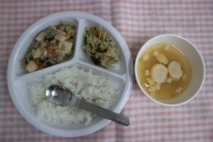 11月4日(火)給食・おやつ 公開済み: 2025年11月4日更新: 2025年11月4日作成者: ことね保育園カテゴリー: 調理室から 給食🍚🍴 ☆ごはん ☆高野豆腐チャンプルー ☆切干大根ナムル ☆みそ汁(麩、油揚げ、万能ねぎ) 乾物を使った献立✨✨ カルシウム、鉄分がたくさん入っている乾物は、積極的に食べたい食材ですね🤗🎶✨ おやつ(🕒✨15時) ☆ホットケーキ ☆麦茶 人参たっぷりホットケーキ✨✨ ふんわりしていて食べやすかったね~😋 関連記事 3月31日(月)給食 給食🍚🍴 ☆ごはん ☆ポークビーンズ ☆白菜サラダ ☆みそ汁(小松菜、豆腐) 年度末最後の給食🍚🍴 みんなの好きなポークビーンズでした😋 […] 公開済み: 2025年4月2日更新: 2025年4月2日作成者: ことね保育園カテゴリー: 調理室から 29 11月29日(木)給食・おやつ 給食🍚🍴 ☆ドライカレー ☆コールスローサラダ ☆ツナポテト ☆すまし汁(小松菜、エノキ) 子どもも大人も大好きなカレー💛 カレーにはスキムミルクが入って […] 公開済み: 2018年11月29日更新: 2018年11月29日作成者: ことね保育園カテゴリー: 調理室から 11月22日(金)給食・おやつ 給食🍚🍴 ☆ごはん ☆ポークチャップ ☆キャベツの海苔和え ☆スープ(豆腐、万能ねぎ) 冬キャベツ✨美味しいですよね~🤗 ぎゅっと葉が重なり合っていて、肉厚 […] 公開済み: 2019年11月22日更新: 2019年11月22日作成者: ことね保育園カテゴリー: 調理室から