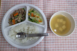 12月1日(月)給食・おやつ 公開済み: 2025年12月1日更新: 2025年12月1日作成者: ことね保育園カテゴリー: 調理室から 給食🍚🍴 ☆ごはん ☆豚肉のプルコギ風 ☆キャベツサラダ ☆みそ汁(豆腐、わかめ) 肉厚なキャベツをたっぷり使ったサラダが好評でしたよ~😝👏 彩りを工夫し、食べたいな~😁と思ってもらえるように心掛けました😋💖 サッパリ美味しかったね~! おやつ(🕒✨15時) ☆わかめおにぎり ☆麦茶 昆布出汁とスキムミルクを入れて炊き上げたごはんをおにぎりにしましたよ~😁 食べやすかったね~🤗🎶✨ ごちそうさま~! 関連記事 9月16日(火)給食・おやつ 給食🍚🍴 ☆ごはん ☆ポークビーンズ ☆白菜サラダ ☆みそ汁(小松菜、豆腐) じゃがいもが入ってボリューム満点なポークビーンズ✨✨ 甘めのトマト味でみんな大好 […] 公開済み: 2025年9月16日更新: 2025年9月16日作成者: ことね保育園カテゴリー: 調理室から 12月19日(火)給食・おやつ 給食🍚🍴 ☆ごはん ☆鶏肉のオニオンソース ☆野菜のコンソメ煮 ☆すまし汁(高野豆腐、万能ねぎ) 甘酸っぱいオニオンソースが鶏肉に良く合います~😋🎶 […] 公開済み: 2023年12月19日更新: 2023年12月19日作成者: ことね保育園カテゴリー: 調理室から 4月1日(木)給食・おやつ 給食🍚🍴 ☆ごはん ☆豚肉のプルコギ風 ☆キャベツの和サラダ ☆みそ汁(小松菜、油揚げ) 今日から新年度❣❣ 子ども達も進級して、気分一新~❣& […] 公開済み: 2021年4月1日更新: 2021年4月1日作成者: ことね保育園カテゴリー: 調理室から