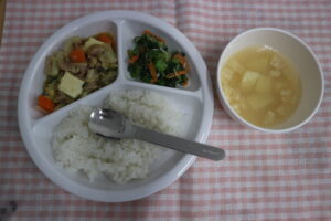 4月6日(月)給食・おやつ 公開済み: 2026年4月6日更新: 2026年4月6日作成者: ことね保育園カテゴリー: 調理室から 給食🍚🍴 ☆ごはん ☆カレー肉豆腐 ☆小松菜とじゃこのサラダ ☆みそ汁(じゃがいも、油揚げ) おやつ(🕒✨15時) ☆黒糖米粉蒸しパン ☆麦茶 関連記事 12月11日(金)給食・おやつ 給食🍚🍴 ☆ごはん ☆肉じゃが ☆麩と青菜の和え物 ☆みそ汁(豆腐、大根) カルシウムたっぷり❣❣小松菜を麩と一緒に和え物にしました~🎶 […] 公開済み: 2020年12月11日更新: 2020年12月11日作成者: ことね保育園カテゴリー: 調理室から 1月24日(金)給食・おやつ 給食🍚🍴 ☆ごはん ☆ひじきつくね ☆青菜炒め ☆スープ(白菜、コーン) 今日の青菜は小松菜です! カルシウム豊富な小松菜は積極的に食べたい食材です😋✨ […] 公開済み: 2025年1月24日更新: 2025年1月24日作成者: ことね保育園カテゴリー: 調理室から 10月7日(月)給食・おやつ 給食🍚🍴 ☆ごはん ☆豚肉とさつまいものケチャップ煮 ☆白菜サラダ ☆すまし汁(キャベツ、油揚げ) さつまいもの自然な甘さを活かして、砂糖不使用で煮ました🍠 ベースの味付 […] 公開済み: 2019年10月7日更新: 2019年10月7日作成者: ことね保育園カテゴリー: 調理室から